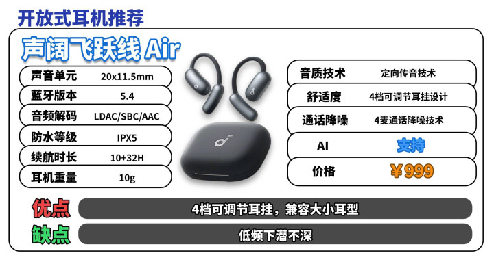 音质方面,声阔飞跃线Air搭载20×11.5mm大尺寸动圈单元,搭配Bass Turbo低音增强技术,在强化低频质感与爆发力的同时,能确保三频均衡协调。该耳机支持LDAC高清编码,且斩获Hi-Res Wireless金标认证,处理高码率音源时,可清晰呈现细腻饱满的音频细节。