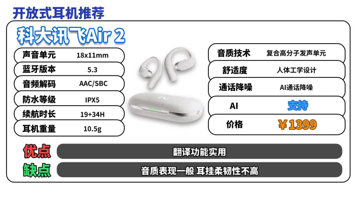科大讯飞Air2采用开放式挂耳式设计,耳挂经过人体工学调校,单耳约9.8克的重量搭配亲肤硅胶材质,久戴也不会给耳部带来明显压迫感。即便在跑步、跳跃等高强度运动场景中,耳机也能稳固贴合耳廓,不易脱落。开放式结构可让用户实时感知周遭环境音,大幅提升户外运动安全性,但被动隔音效果较弱,更适配运动场景使用。