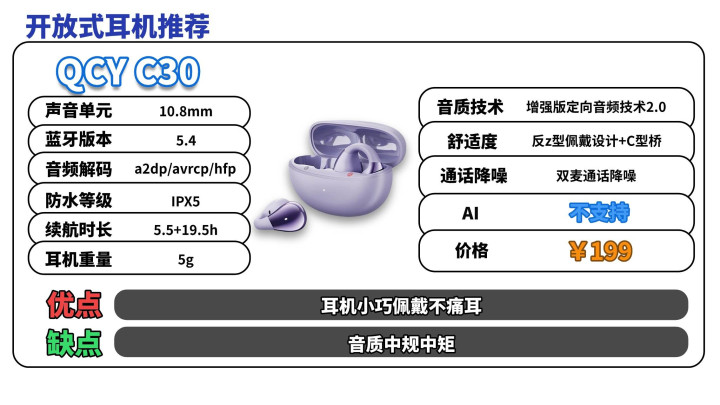在国内入门级耳夹耳机测评圈里,QCY C30凭借高辨识度外观和舒适佩戴感斩获诸多好评,加之通过了行业品质认证,深受追求个性与高性价比的年轻群体喜爱。这款产品以亲民定价兼顾了独特设计与实用体验,成功跻身入门级市场热门爆款行列,实现销量与口碑的双丰收。