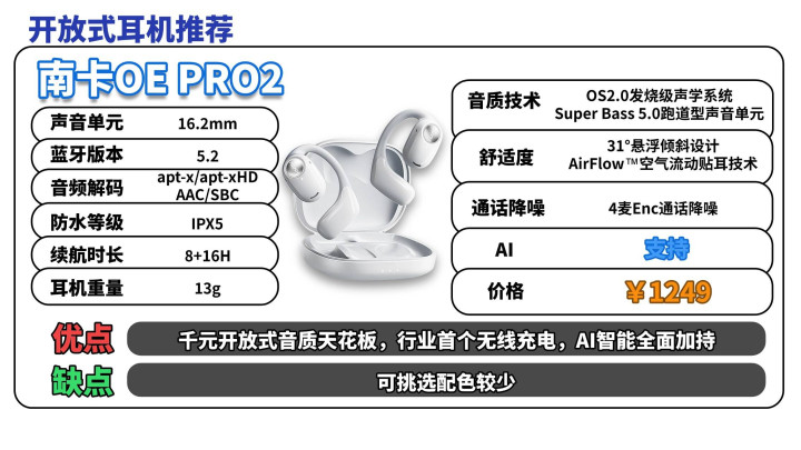 作为深耕音频领域的专业品牌,南卡始终以音质与舒适度为核心竞争力,OE Pro2更被誉为该品类中实力顶尖的代表机型。在两千元内价格段,它凭借自主研发单元、先进声学系统及完善的配置体验,展现出远超同级别产品的硬实力,赢得了HiFi发烧友与专业媒体的高度赞誉。