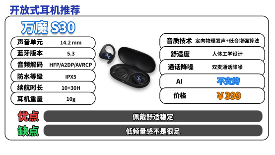 这款耳机配备定向发声单元,能在贴近耳部的区域将声音精准定向传入耳内,即便身处嘈杂环境也能保障良好听音效果,同时有效减少声波外泄。在音质层面,万魔S30内置14.2mm类钻石振膜动圈,还搭载了低频增强算法,可呈现出更为浑厚强劲的低音表现,让整体音乐体验变得更具层次感与饱满度。